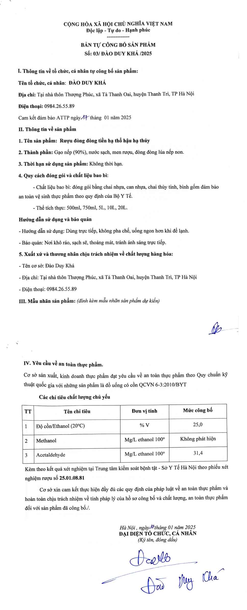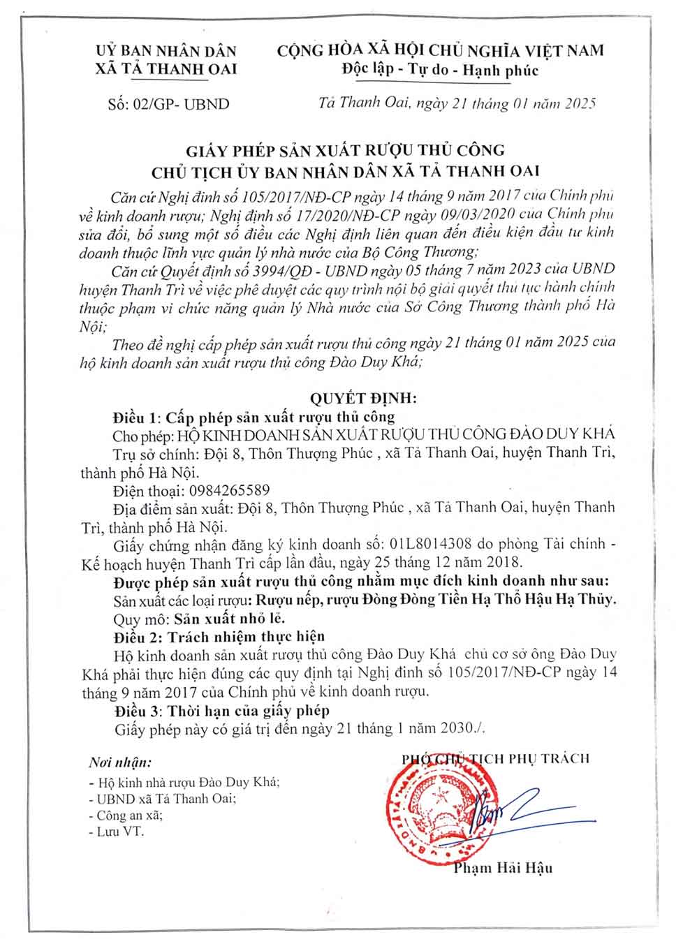 Hiện nay cơ sở sản xuất rượu đòng đòng đã hoàn thiện pháp lý giấy phép về sản phẩm giúp khách hàng yên tâm về mặt pháp lý, xuất xứ hợp pháp sản phẩm và thuận lợi hơn quá trình kinh doanh, phát triển.